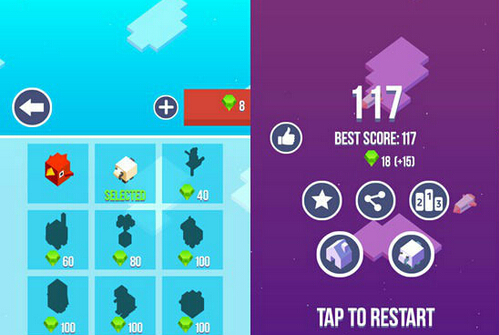 沿途上會灑落一些寶石,玩家將其撿取並收集到一定數量時就能購買角色。雖然本身沒有什麼能力加成,不過換個角色造型還是可以有的。