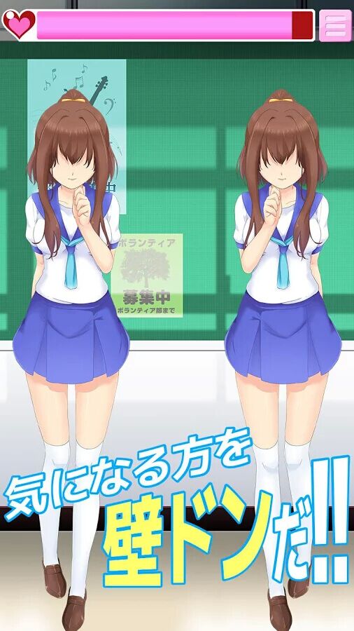 玩家在遊戲中扮演一名高中生,要對心儀的女孩進行壁咚。每次畫面中會出現2個女孩子,玩家要在他們之間選擇一位進行壁咚,依照玩家的選擇不同,會有不同的結局,其差異可是從天堂到地獄的區別。為了獲得心愛女孩的答復,賭上靈魂來進行壁咚吧。