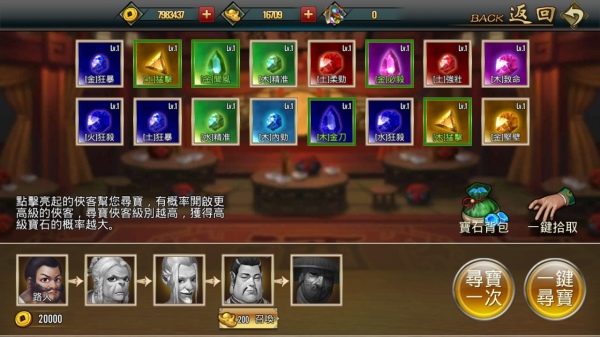 尋獲的寶石分為金、木、水、火、土五種屬性,這五種屬性分別對應玩家自身的基礎攻擊或反抗性,像是屬性為「金」的寶石可以增加俠客的堅韌度,鑲嵌至龍泉劍可大幅減少敵方的暴擊幾率,而其他寶石的獨特屬性,就讓俠客們親自探索啦!