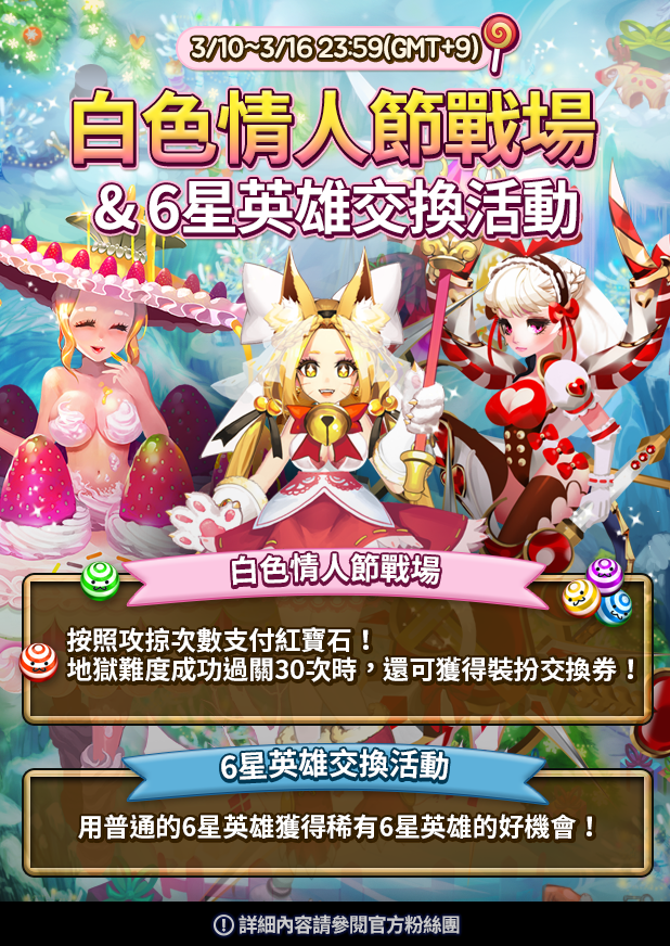 3/10~3/16止,遊戲內實裝白色情人節活動戰場,由打扮成糖果和餅乾的小怪跟魔王登場和)玩家廝殺,刺激滿點,可愛爆表。過關時會掉落S、A、B、C四個等級的箱子,開箱就有大量金幣、紅寶石等豐富好禮,完成挑戰任務還能獲得裝扮交換券,為自己心愛的英雄穿新衣。