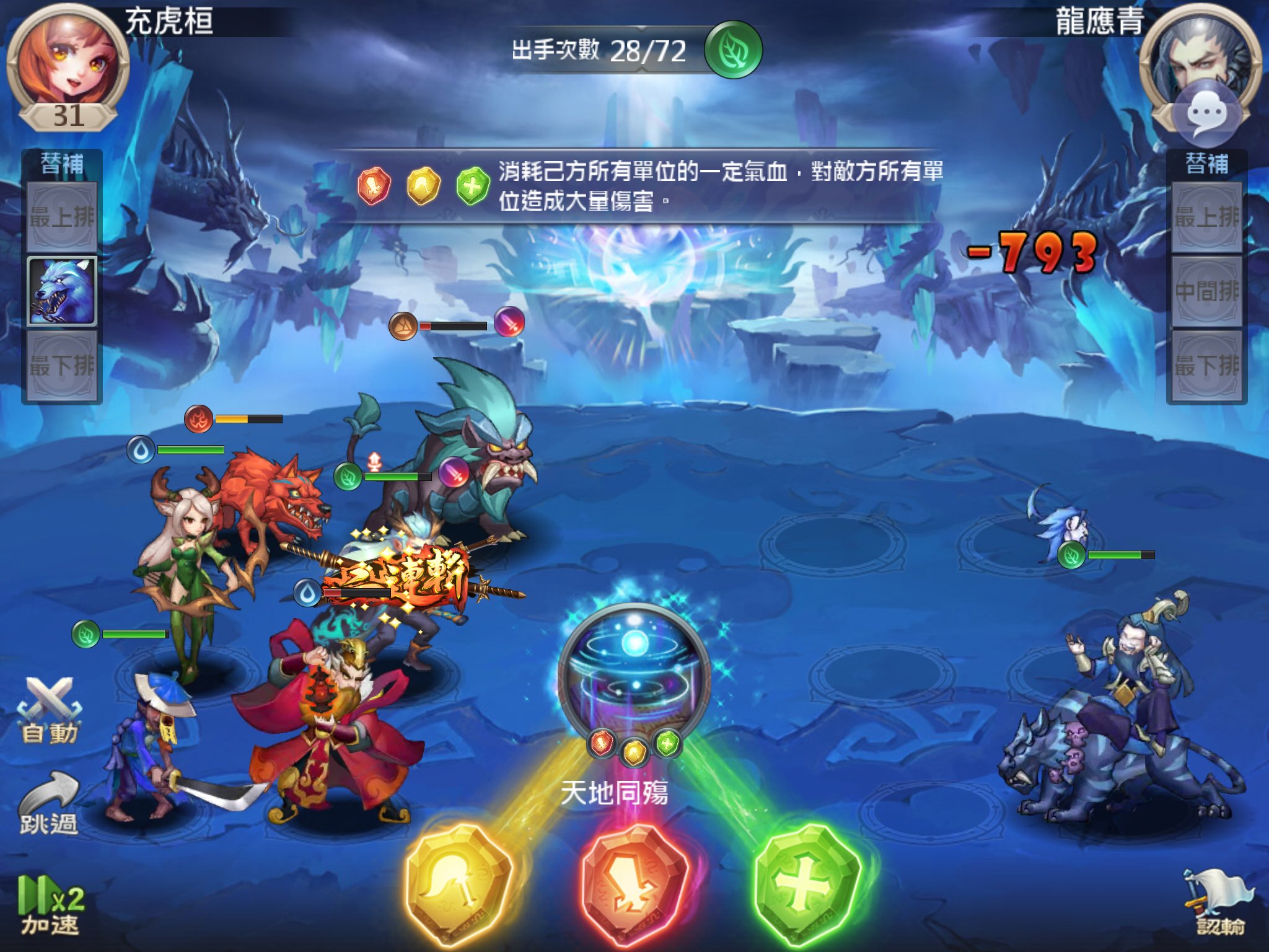 按照紅-黃-綠組合的大招為“天地同殤”,是一個消耗己方一定血量來對敵方造成全體大量傷害的大招技能。這個技能能夠造成大量的傷害,但是使用時一定要考慮己方靈僕的血量哦!當戰鬥接近尾聲而己方狀態較好時,可利用該技能快速結束戰鬥!