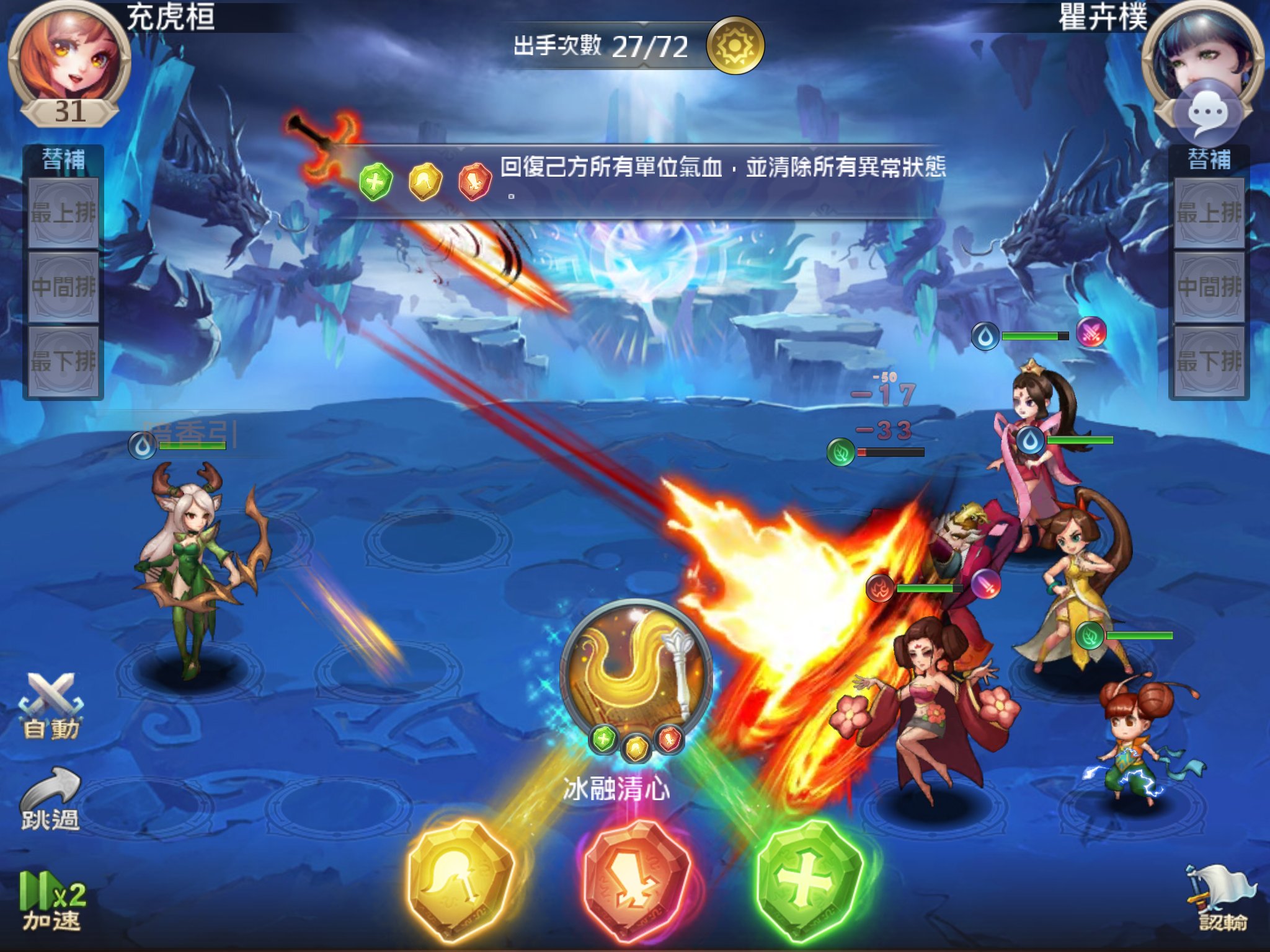 按照綠-黃-紅組合的大招為“冰融清心”,能夠回復己方所有單位的血量,還能夠清除所有異常狀態。在戰鬥中,當你的靈僕們血量偏低時,趕緊使用這個技能吧!而如果有靈僕陷入混亂等狀態,一定記得用該技能消除異常,避免損失戰鬥力和對自己造成傷害!