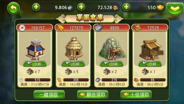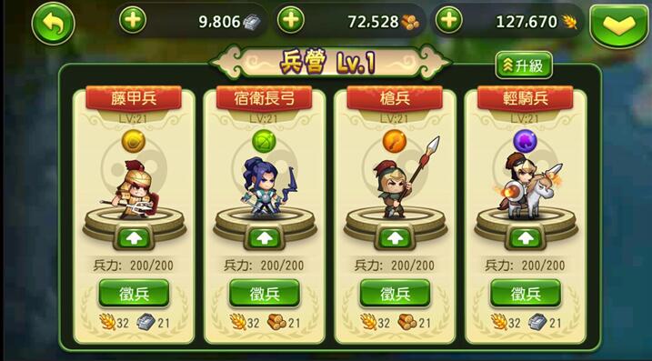 徵兵的同時需要消耗一定的材料,除了透過關卡能夠獲得外,還可以透過【軍團倉庫】來定時收取相關的材料,讓玩家可以更快速的提升小兵的等級。