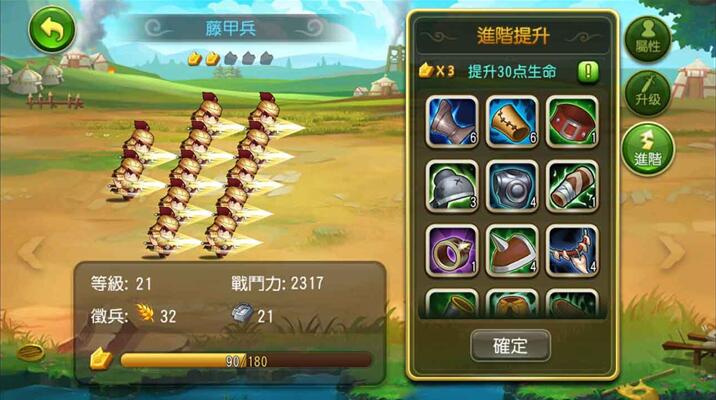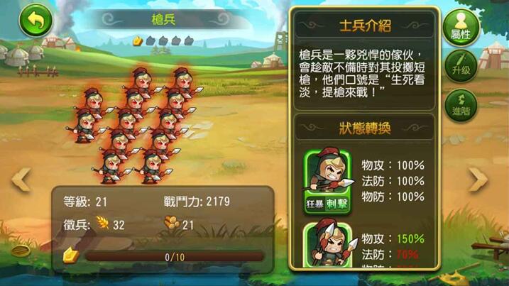 當小兵進展突破到一定等級後,將會提升兵種的類型,如:【步兵】會進階成為【藤甲兵】,除了外觀會有改變外,其相關的屬性、能力等數值,也會隨之改變。