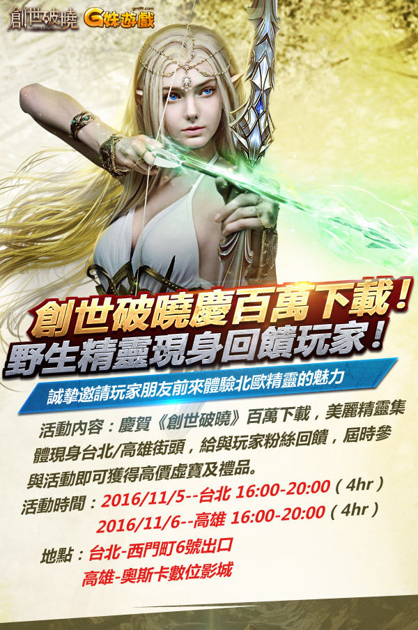 如果你想和美人來一場難忘邂逅,如果你想一睹人氣西洋精靈的風采,並帶走讓人眼紅的虛寶,這個週末的台北西門町和高雄新崛江就是你的不二之選!由性感女神張景嵐代言,以精靈、矮人和人族尋戒故事為主線的3D魔幻手遊《 創世破曉 》正在不刪檔封測中,欲知更多遊戲詳情,歡迎光臨G妹遊戲《 創世破曉 》官方臉書。