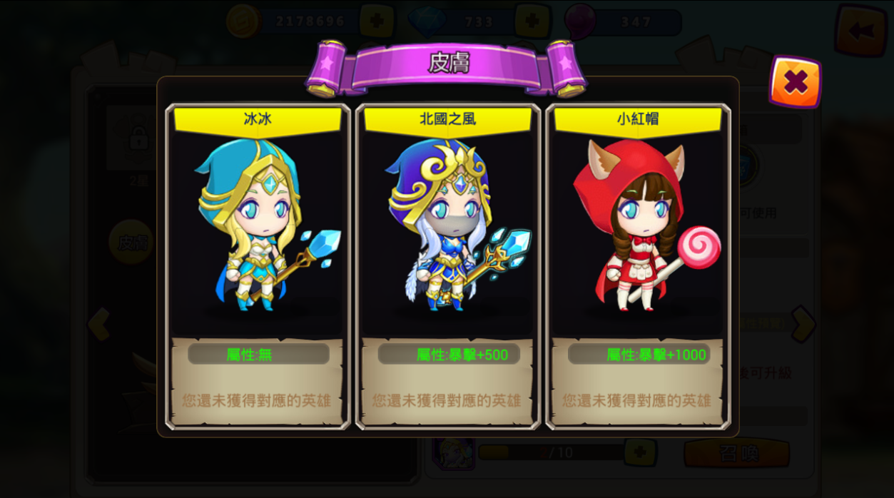 遊戲中可以為英雄購買皮膚進行換裝,不單單只是造型變化這麼簡單喔~技能的特效也會隨著皮膚進行改變,收集皮膚讓你的英雄隊伍煥然一新吧。目前官方透露皮膚的設定有將近300多種並且還會持續更新,獲取途徑也多種多樣,外觀黨必備啊。
