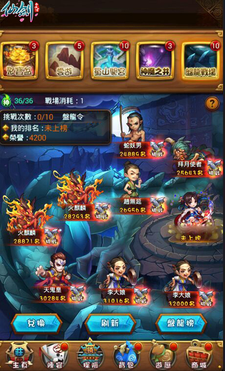 《 仙劍奇俠傳 》版本更新,推出的新跨服玩法「盤龍戰場」按服務器分為兩個大區,前1-10服為一個大區,11服及其以後服為一個大區,讓玩家跨服競技爭奪王者榮耀。等級達到50等的玩家,即可自動開啟該玩法,每日擁有10次免費挑戰機會,每次需消耗1點神進行挑戰。若挑戰次數不足時,玩家可消耗盤龍令來增加。玩家挑戰勝利則佔據被挑戰者的位置,挑戰失敗時位置不變;不論挑戰成功與失敗均可獲得榮譽,榮譽可用以兌換獎勵。同時,系統會在每日20:45根據玩家的排名發放排名銀兩及榮譽獎勵,並重置免費挑戰次數。
