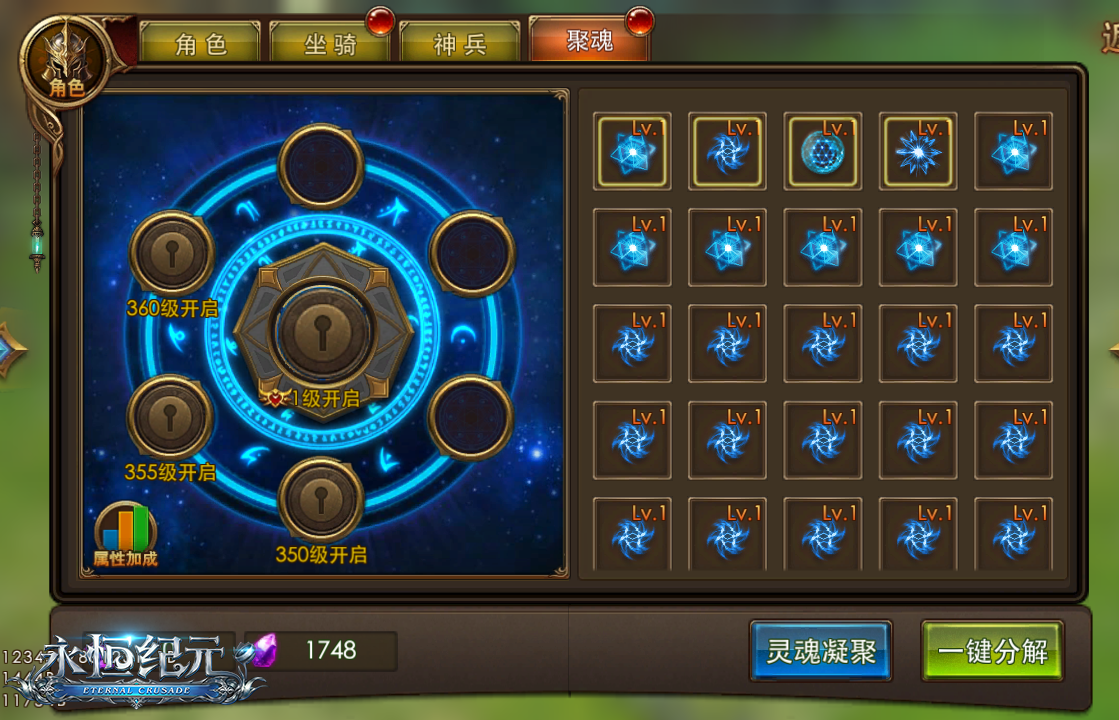 從“黑暗之門”多下怪物之魂後,該怎麼化為我用呢?聚魂系統這就派上用場啦!玩家達到330級後即可在角色面板裏開啟聚魂系統。聚魂系統最初共設七個槽孔,玩家可精選適合自己的怪物之魂放置在槽孔中,之後也可自由替代。