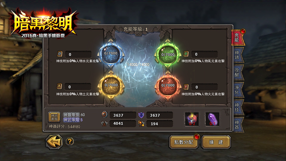 靈之神器已降臨暗黑大陸,為勇士戰鬥提供強大幫助!而本次更新開放的「神器充能系統」,將帶來神技與元素雙屬性提升!充能玩法中有總能量池和四個分別代表水、火、風、土元素的分能量池,培養充能可大量提升屬性。
