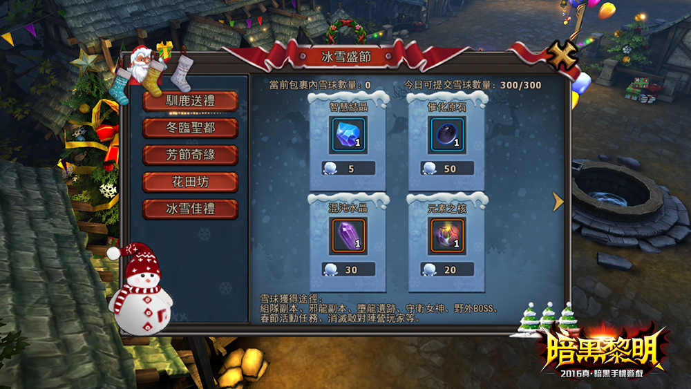為了和廣大玩家歡慶聖誕佳節,即日起至1月3日,登錄《 暗黑黎明 》即可獲得聖誕豪華禮包。蒐集雪球大行動同步開跑,參與日常活動、儲值活動以及商城禮包購買即可獲得雪球,蒐集到一定數量的雪球即可活動商城中購買超值禮包。趕快進入暗黑大陸蒐集雪球贏取聖誕限定好康吧!