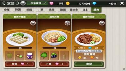 全新食譜鮮蝦越南春捲、越南炸春捲、酥脆的越南炸春捲、牛肉越南河粉、越南烤肉排、雞肉越式法包等道地口味開胃出菜,同時,一定要使用相關料理器具才能烹飪出銷魂的越南菜。每道越南料理都要不間斷的學習精進,才能成就出終極佳餚,當菜色食譜升級後,即可收集完整全新套餐並同時開啟2種新的打工模式。
