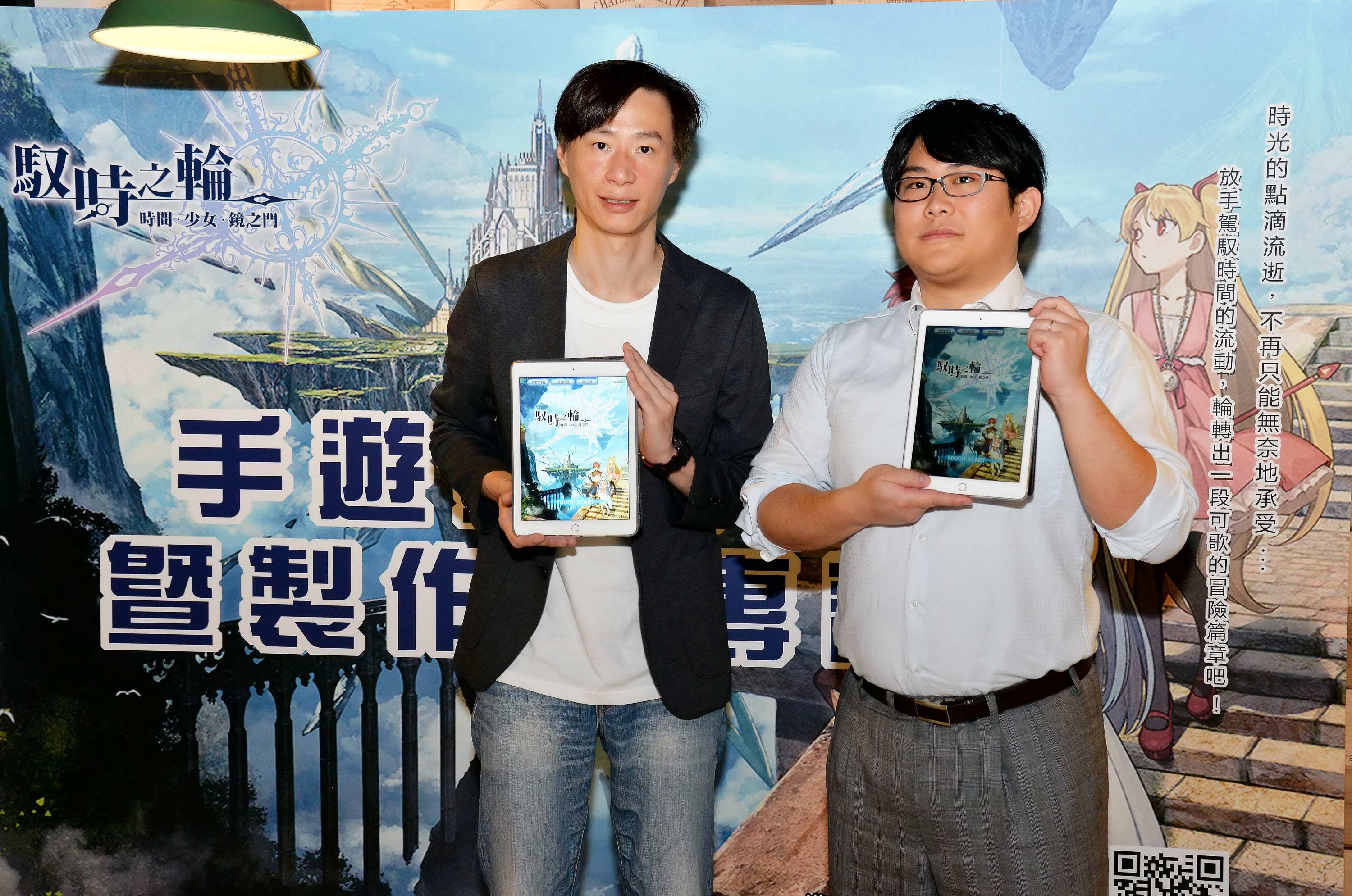 遊戲橘子《 馭時之輪 》產品負責人邱靖鈞(左)與遊戲製作人山本達也(右)為《 馭時之輪 》中文版雙平台不刪檔封測開跑宣傳