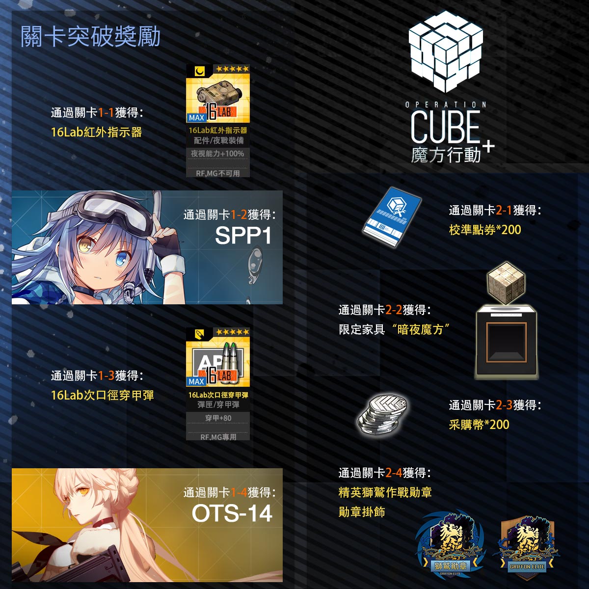 魔方行動+中包含了「魔方行動」與「盲拆法則」兩個章節,分別有四小結,總計八小結,全數皆為夜戰關卡。活動中將開啟特殊的「斬殺系統」,閃爍的血條代表該關卡需要被通關相應次數才能夠完全通過,進而解鎖下一個關卡。每小結通關後皆可獲得與之對應的獎勵,其中不乏包含強化作戰效能的裝備、遊戲幣和限定傢俱外,凡通關1-2可獲得限定人形SPP-1,通關1-4即可獲得5星限定人形OTs-14!