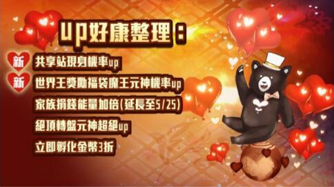 此次更新除了延續「絕頂轉盤元神超絕up」、「立即孵化金幣3折」等好康活動外,使用共享站時「天公」、「西王母」、「釋迦牟尼佛」等元神出現機會也將明顯提升。在挑戰世界王方面,此次亦可獲得新版獎勵福袋,其中「獲得魔王元神」的機率將比原始福袋提高許多,趁此機會多多收藏這些元神,對於往後提升元神技能或是戰隊組成都將大有助益!