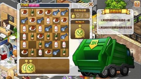 垃圾資源回收區出現了小遊戲提醒圖示,就可以點選它進行資源回收小遊戲。在限制的時間內,把相同種類的回收物品連成橫向或縱向一直線,就可以裝成一袋垃圾,再將垃圾袋,全部丟進垃圾車裡,即可完成小遊戲。湊成的直線中,若包含Bonus欄位,則可額外再爭取一些資源回收時間。