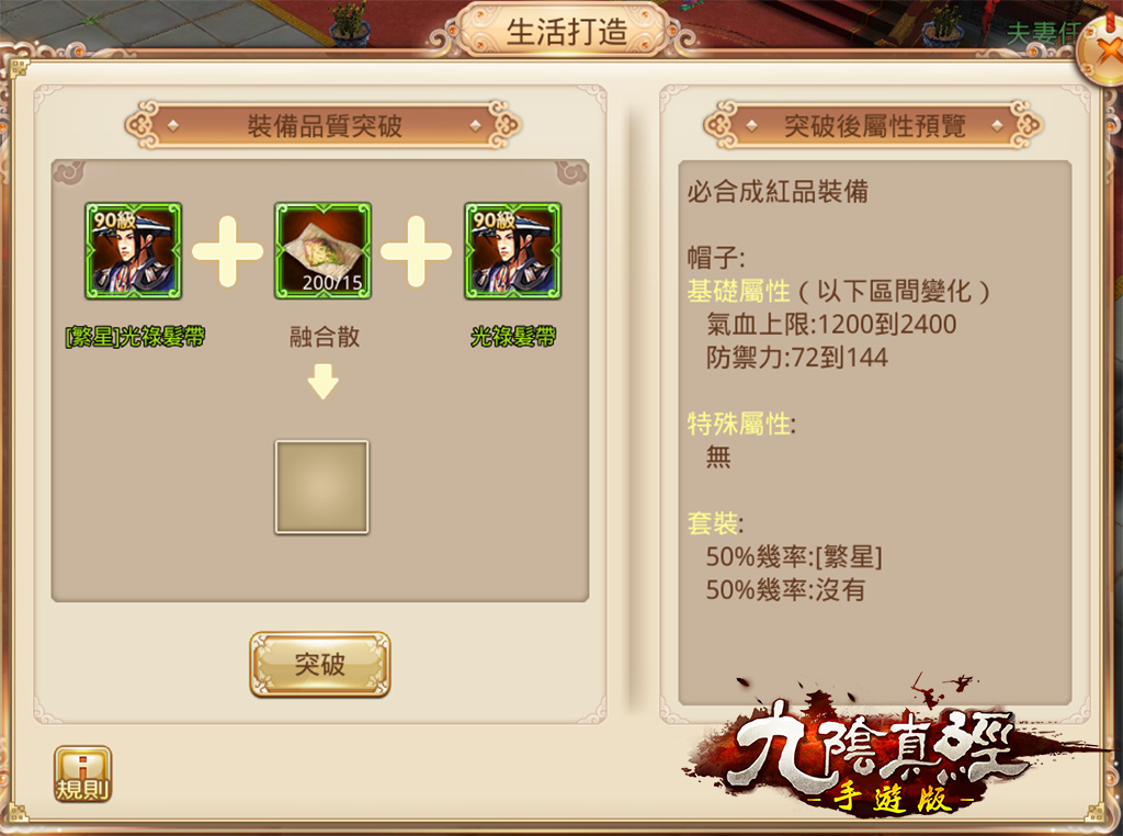 工欲善其事,必先利其器。有了強大的功力為後盾,相對的裝備也要有所提升,改版後玩家可將90級以上金玉裝備進行裝備品質突破,突破後裝備基礎屬性和特殊屬性將大幅提升,更具殺傷力。