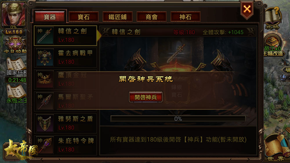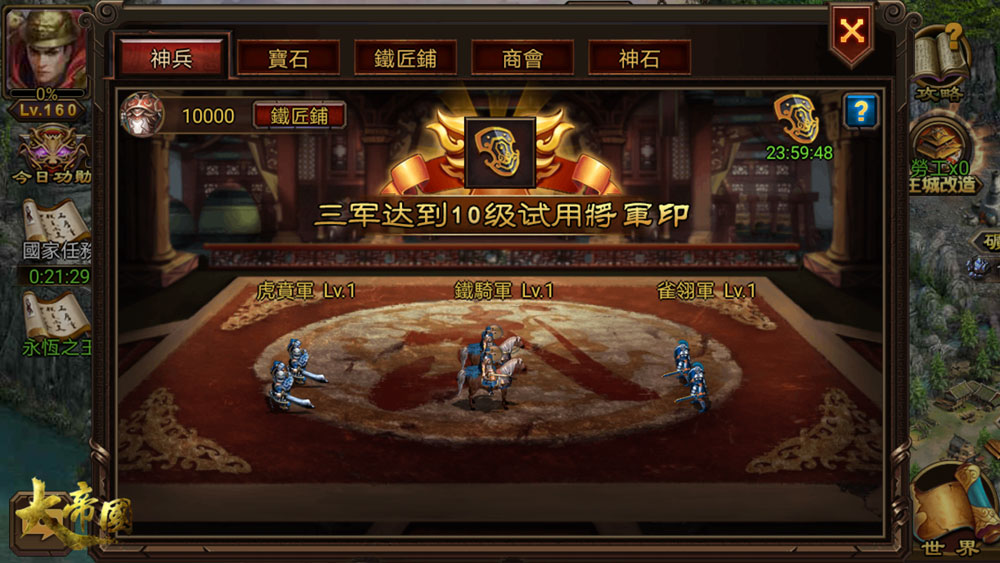 當所有寶器均達到180級後,玩家即可開啟神兵功能,通過消耗甲胄來提升神兵部隊的等級,每支神兵升級後都可獲得相應的屬性加成。開啟神兵或3支部隊每提升10級,都可獲得24小時的試用將軍印(正式將軍印暫未開放)。一旦擁有將軍印,你便成為一人之下,萬人之上的統領,可在世界地圖中建立個人專屬封地,獲得糧食、鐵礦等重要資源。