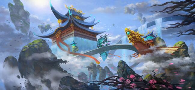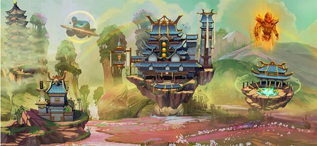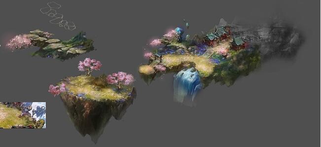 圖三、遊戲場景之一「九重天」美術設計概念圖,大氣恢弘,仙島林立。