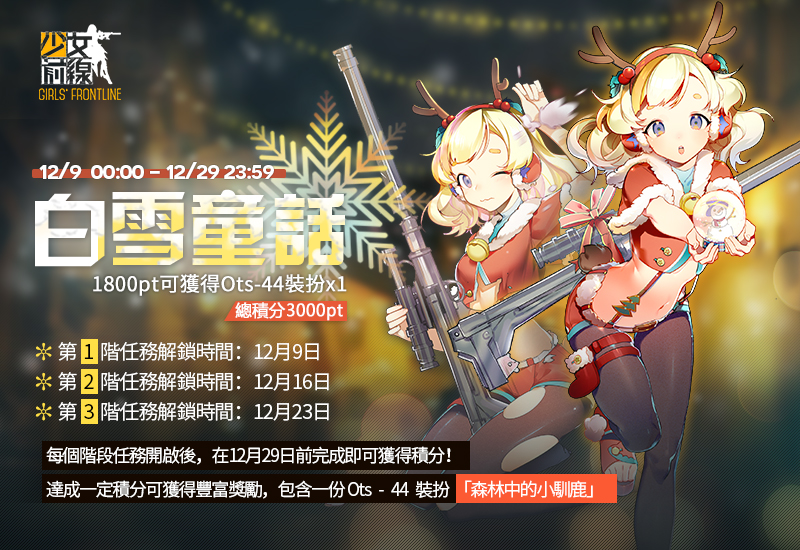雪花隨風飄!少女在奔跑!穿著聖誕服飾的少女們來了!官方為迎接聖誕節,於遊戲中搶先推出期間限定的「白雪童話」活動,凡於期間內完成各階段指定任務獲取積分即可獲得豐富獎勵,活動期間內完成1800積分即可獲取OTs- 44-「森林中的小馴鹿」聖誕裝扮喔!