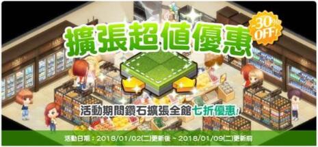 2018/01/02(二)更新後~2018/01/09(二)更新前,百貨版圖再躍進,全館鑽石擴張七折優惠,各樓層全面擴大營運,新添購娛樂設施及其它裝飾好時機!