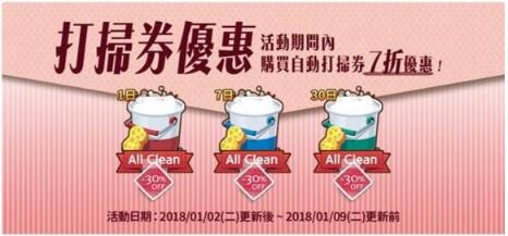 2018/01/02(二)更新後~2018/01/09(二)更新前,活動期間內,自動打掃券1日、7日及30日全面七折優惠,一指點點除舊佈新好輕鬆。