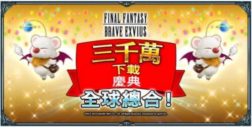 今 (2018/3/6) SQUARE ENIX® 正式宣佈,由Square Enix Inc.與gumi Inc.進行聯合開發、營運,全球熱賣的人氣手遊 -FINAL FANTASY® BRAVE EXVIUS®, 國際版於全球下載數正式突破3000萬!為紀念這個偉大的歷史時刻,將舉辦一系列的盛大慶祝活動,玩家將有機會獲得豐碩的獎勵與贈禮!