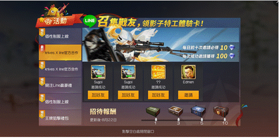 為了慶祝與《LINE》結合,遊戲官方也準備了多樣的活動獎勵大禮,來犒賞給玩家們!只要你綁定LINE帳號、邀請朋友用LINE註冊遊戲,都將有機會得到大量的鑽石、影子特工時裝、爆炸頭隨機寶箱等豐富的獎勵。