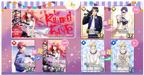 l   活動內容:Happy Birthday! 11月是古市 左京、伏見 臣的生日,一起來慶祝他們的成長吧!玩家可於活動期間內前往高級招募入手11月限定劇團成員。成功入手SSR【滿開Birthday】古市 左京、SSR【滿開Birthday】伏見 臣後提升親密度,即可解鎖限定的後台劇情,還有機會與他進行兩人的生日約會?!且在本次限定招募中所獲得的限定劇團成員,將可能對未來所展開的活動有加成效果?!