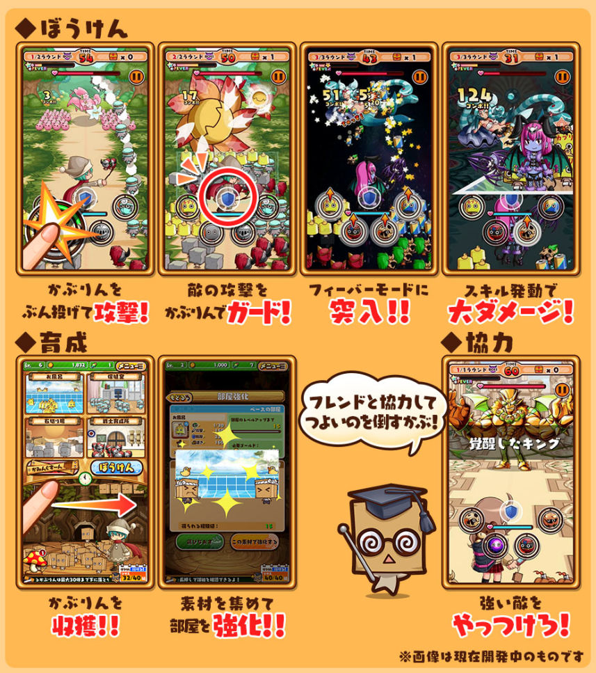 只要點擊就能投擲 Kaburin 攻擊敵人的簡單操作,讓不擅長動作遊戲的玩家也能輕鬆享受遊戲的樂趣。也可以運用 Kaburin 成為盾牌防禦敵人的攻擊、使出蓄力攻擊打破敵人的防禦、施放技能對敵人造成重傷害等等。磨練技術以高得分為目標,而且也可以和朋友競爭唷。