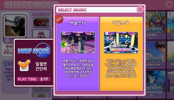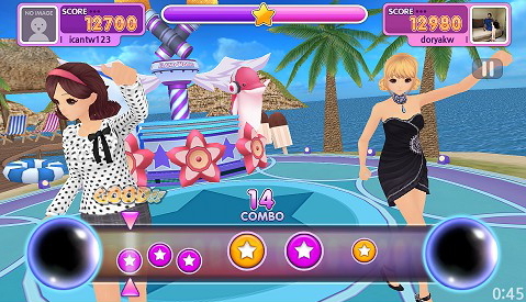舞蹈 模式供選擇,分別為「節奏星模式」以及「泡泡星模式」,在節奏星模式當中,節奏點將同步從畫面中央往左右兩邊移動,並當節奏點到達時同時觸碰畫面的左右兩側的敲擊點,COMBO 的產生將隨難度自動調整﹔而泡泡星模式,節奏點將會隨機出現在畫面任意的位置,提升遊戲難度,這些節奏點將隨歌曲而有所不同,在正確的時間完成點擊,將可以獲得分數,當然也有排行榜功能,舞王舞后個人資料也會同步顯示。