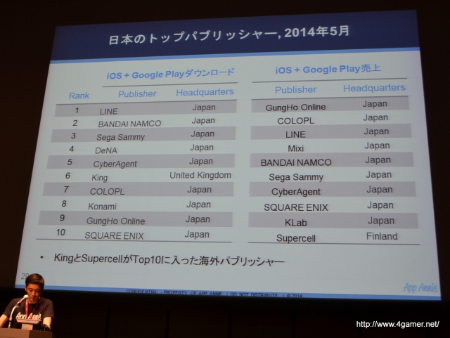 接下來桑水將各國的遊戲下載次數及銷售等傾向以投影片的方式作介紹。在此是用 2014 年 5 月的資料。