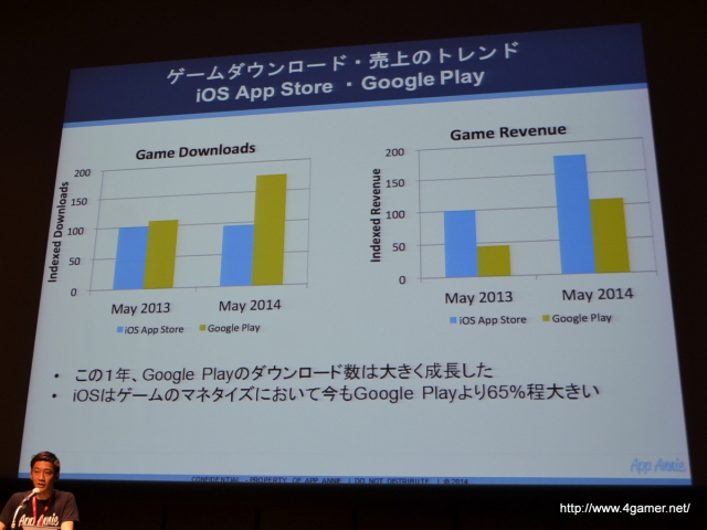 在下載次數方面,Google Play 這一年有大幅成長,而 App Store 則是略微減少。至於銷售上則是雙方都有成長,與去年比較之下,App Store 有 1.6 倍,Google Play 則是 2 倍以上。另外桑水表示,從遊戲收益上來看的話,App Store 比 Google Play 還要多 65%。