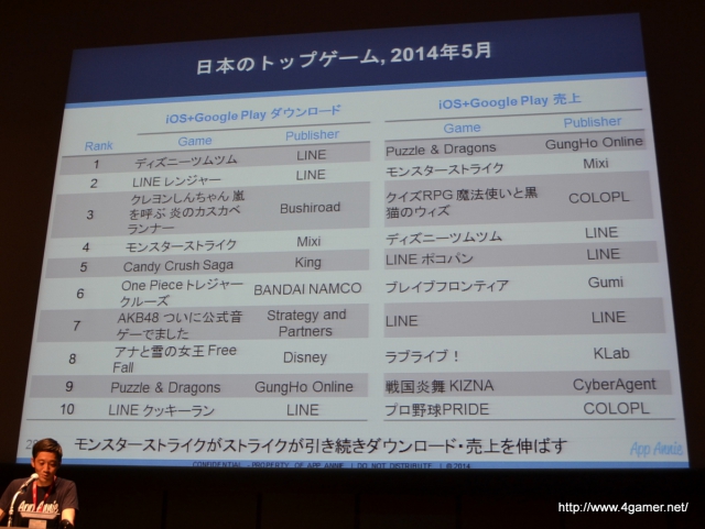 幻燈片所顯示的是 App Store 跟 Google Play 合計出來的排行榜,下載次數是由《LINE: Disney Tsum Tsum》(Android/iOS),銷售則是由《龍族拼圖(Puzzle & Dragons)》(Android/iOS)獲得首位。而桑水舉出的矚目作品則是《怪物彈珠》(Android/iOS)。