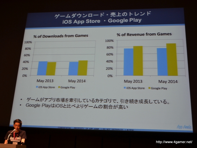 在 App Store(iOS)與 Google Play(Android)中, 市場 整體的下載次數中「遊戲」約佔了 40%,而銷售方面遊戲佔的比率則是更高,特別是在 Google Play 的總銷售額中遊戲就佔了 80% 以上。