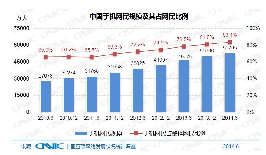 截至 2014 年 6 月,我國線民總量 6.32 億,較 2013 年底增加 1442 萬人,半年增長率 2.3%,全年預計 5% 左右。我國手機線民規模達 5.27 億,半年增長 5.4%,全年有望達到兩位數。手機上網的線民比例達到 83.4%,與此同時,桌上型電腦和筆記本上網用戶的比例均出現小幅下降,手機端線民數量首次超過PC端。但智能手機的出貨量已經躍過頂峰,今年一季度智能手機出貨量 1 億部,同比首次出現下降。