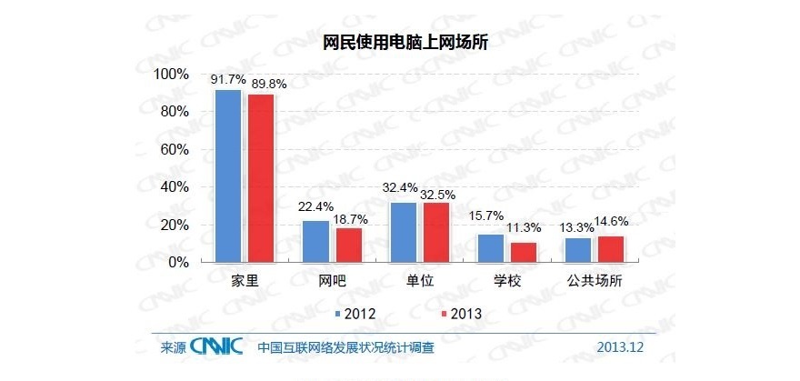 網站的數量在過去半年時間裡也掉頭向下,降幅超過 15%。看來 App 對網頁的衝擊是非常明顯的。在今年年初 CNNIC 的第 33 次 報告 中,已經記錄到線民在家庭、單位、網吧上網頻率的下降,和公共場所上網時間的上升。也許是受限於公共場所 互聯網 接入的限制,這一趨勢在 34 次 報告 中並沒有延續下去。