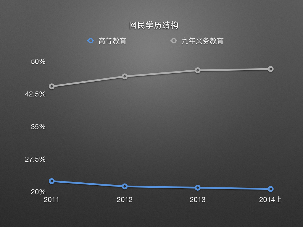 由於 互聯網 向 農村 的滲透,從 2010 年開始接受高等教育的線民比例就一直在下降,而只接受九年義務教育及以下的線民數量一直在上升,接受過大專及以上學歷教育的線民可能在明年跌至 20% 以內。同城市相比, 農村 的 互聯網 仍處在低齡階段。但是不管 農村 還是城市,線民的年齡分佈都在同時向高齡和低齡延伸,他們是線民總量增長的動力。