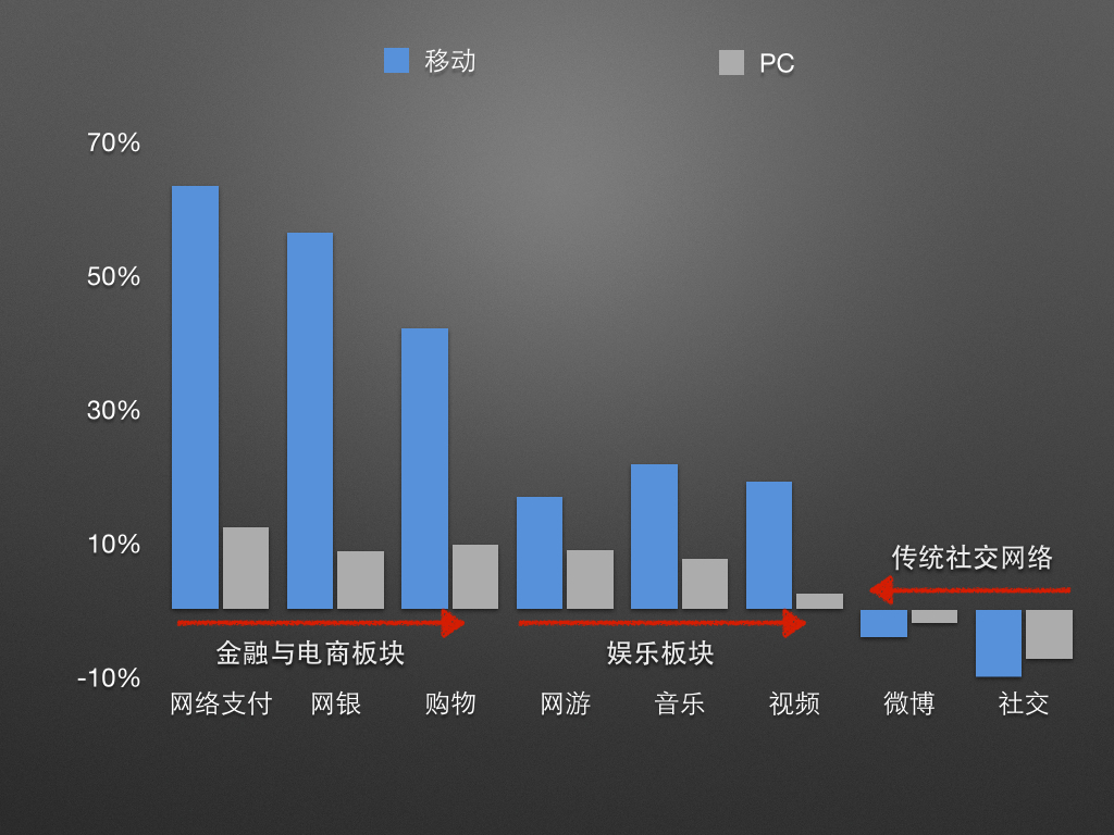 與此同時,網上銀行 + 網路支付 + 網路購物三板斧是使用率增長最快的板塊。這一板塊與電商和 互聯網 金融的發展息息相關。 互聯網 金融在過去一年從無到有,獲得了 10.1% 的用戶使用率。此外,網遊、音樂和網路視頻代表的娛樂板塊發展迅猛,成長性僅次於電商與金融板塊。在未來 4G 網路的帶動下,視頻、音樂等富媒體形式的內容有機會再上一個臺階。