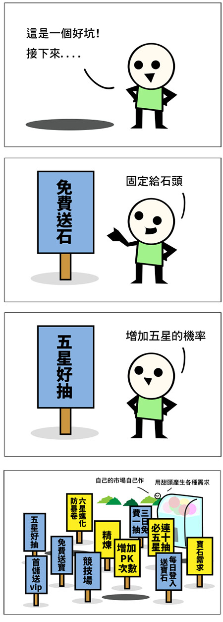 營利點 ,相比上一個多了些東西,這邊我姑且把插圖中的牌子提示稱作「刺激點」,刺激點的用意就是用來激發玩家的各種原始本能,好比賭性、好比滿足感.... 等等。