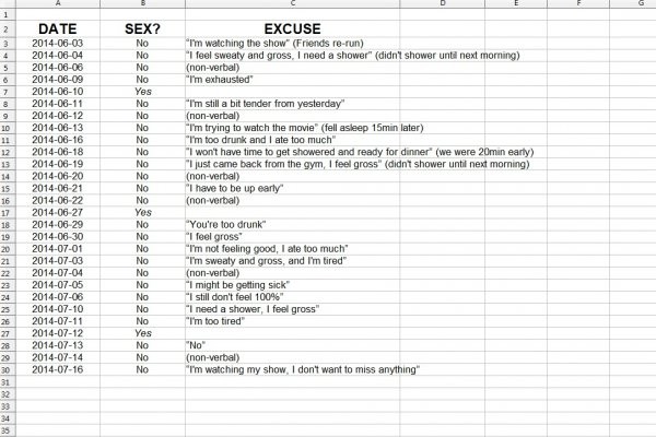 這一切源自於社群網站《Reddit》這幾天被熱烈轉發的訊息,1名叫做throwwwwwaway29的網友在上頭貼出了這張截圖(下圖),宣稱這張表格是她丈夫寄給她的,裡頭詳列著從2014年6月份到現在,她拒絕跟另一半「愛愛」的理由。但是有網友直呼,這些「理由」實在太瞎了,應該是「藉口」才對。