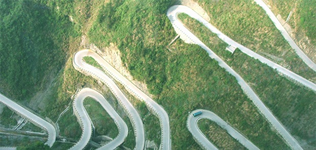 張家界天門山盤山 公路 有「通天大道」之稱,盤山 公路 全長10.77公裏,海拔從200米急劇提升到1300米,大道兩側絕壁千仞,空穀幽深,共計99個彎,180度急彎此消彼長,似玉帶環繞,彎彎緊連,層層迭起,被譽為「天下第一 公路 奇觀」。