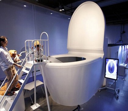 東京博物館展現出馬桶,參觀學生爬上樓梯後,體驗被馬桶沖走。翻攝《中國日報網》