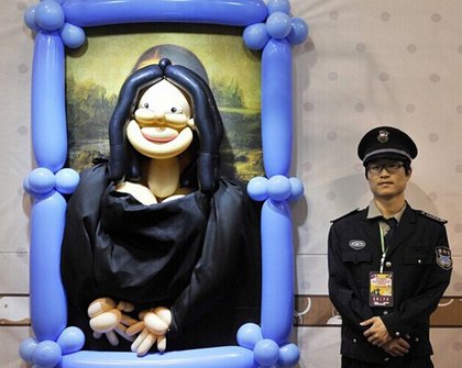 這幅蒙娜麗莎的氣球畫像旁,有警衛在看守。翻攝《中國日報網》