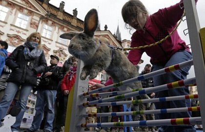 民眾復活節在布拉格看兔子跳高比赛。翻攝《中國日報網》