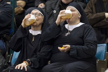 兩名修女看冰壺比賽時,坐在場邊喝啤酒。翻攝《中國日報網》