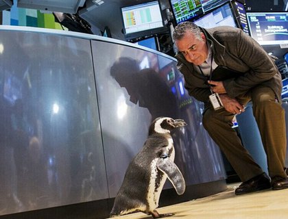 2014 年1月5日,紐約證交所,一名證券交易員看著來自海洋世界的企鹅在證交所裡行走。翻攝《中國日報網》