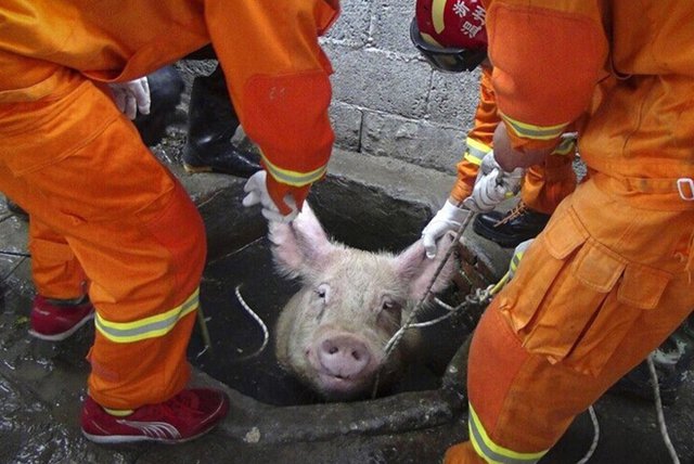中國消防員將一隻母猪從養豬的井裡救出。翻攝《中國日報網》