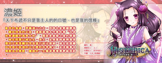 Historica 》多變世界風的「歷史娘」囊括了歐亞非大陸,匯集來自中國、日本、印度、埃及、英國、法國、西班牙等世界各國,官方今日首度揭露日本王女坂額御前和濃姬兩名萌將資訊,讓玩家一睹「歷史娘」淨化風采。
