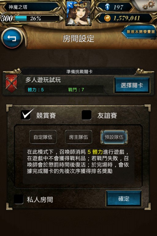 多人遊玩 」中,玩家可以嘗試用不同的隊伍搭配來闖關挑戰。「競賞賽」裡除了常規的使用玩家背包卡片及隊伍競賽,還可以使用房主設定的隊伍或系統預設隊伍。官方表示,每次挑戰只需要消耗 5 體力就能進行遊玩,不論是純粹的休閒玩耍、試玩特別的隊伍,或是進行破關組隊研究,都比遊戲主線遊玩提供了更大的自由空間,在競賽後還能依排名順序得到獎賞和經驗值。