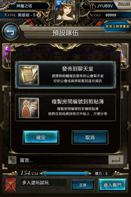 多人遊玩 」的房間內不單設有獨立的聊天室功能,也能在簡單操作下,將房間資訊分享至公會聊天室或複製到剪貼簿,邀請其他玩家加入。